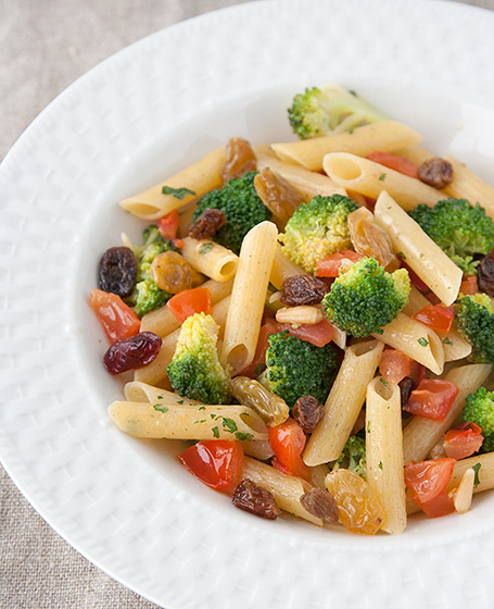 Penne 3 cereales arroz maíz y trigo sarraceno con brócoli piñones y pasas