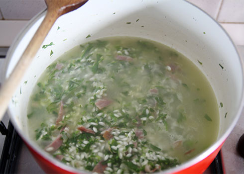 Published 25 May 2015 at 490 × 350 in Risotto con Silene, speck di Sauris e ricotta affumicata aggiunta del brodo.
